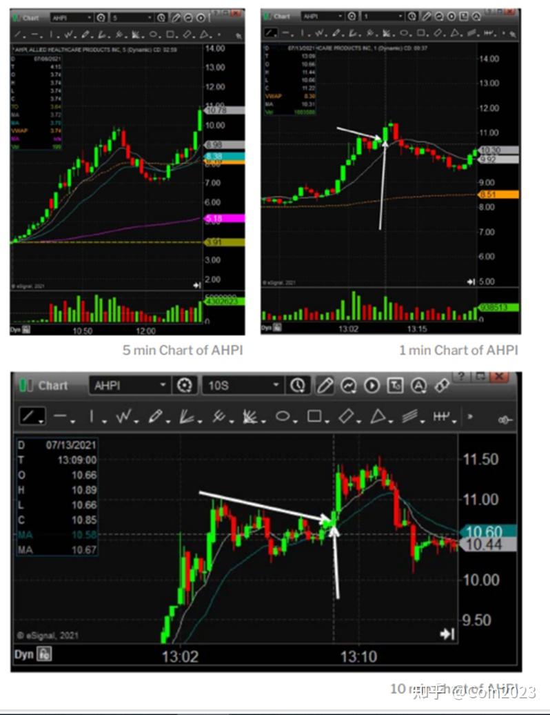 在这个例子中,AHPI在大约12:30pm ET经历了一个强烈的VWAP突破。在12:30–12:50pm之间,有一个在$8–9.00并且高于VWAP(当时价格为$8.18)的调整期。在12:50pm,突破$9.00向上并向当天最高点$9.94的价格突破。如果你错过了发生在$9附近的盘整期入场,下一个最佳入场点是在1:09pm在大约$10.75发生的新突破之后的回撤,这次回撤调整继而引发了向新高$11.54的突破。如果我们用5分钟的图标,那么我们就会错过这两次入场时机,大大提升了交易风险,但1分钟和10秒图表清晰显示了回撤的标准图形,止损位置大约设置为$10.21,当然,当价格持续往上之后我会把止损价格拉到$10.50.