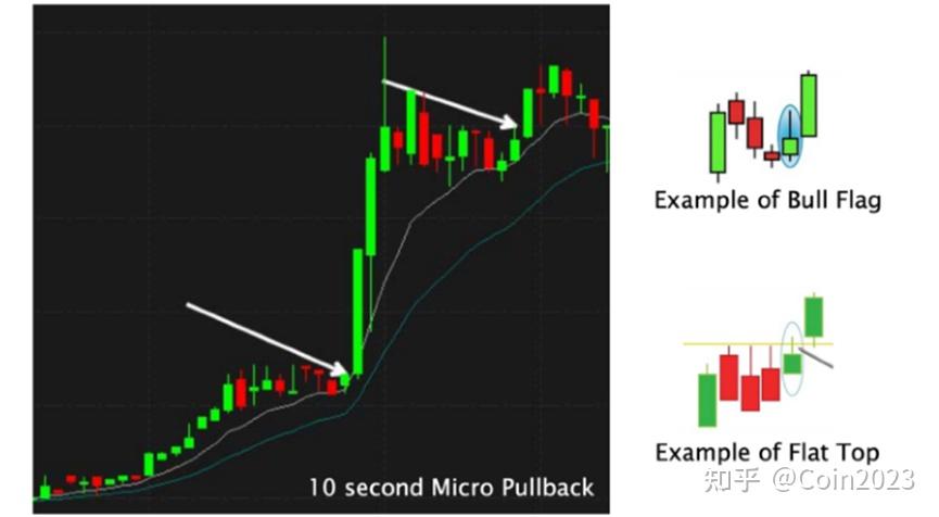 在小于1分钟的图表上,比如10秒图表,回撤通常会呈现为牛旗形态或者平顶突破形态,这是入场的一次确认。与牛旗形态不同,我们不一定要在第一个形成新高的10秒蜡烛图入场,可以等待成交量涌入并突破高点再入场。止损则是回撤的最低点。